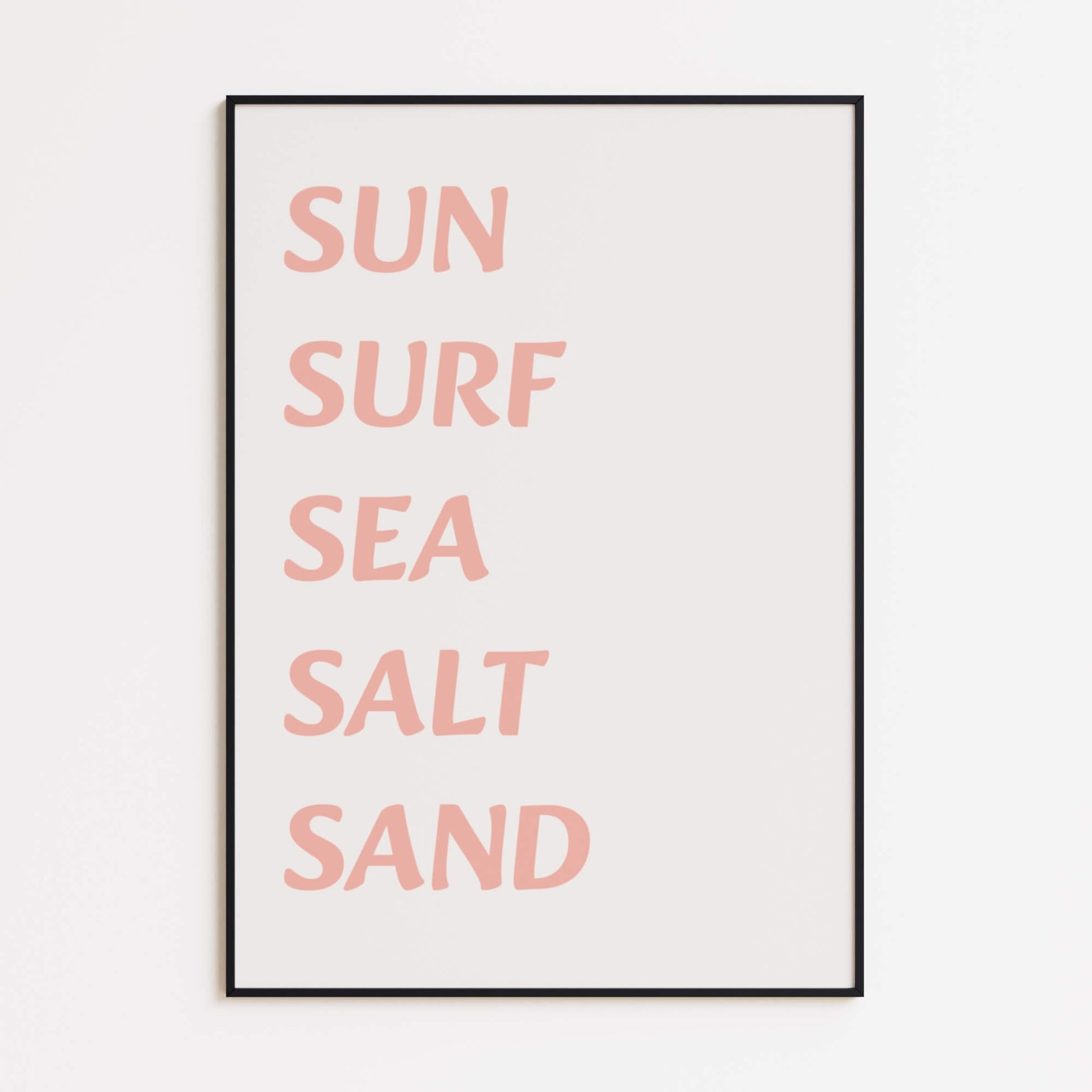 Dieses minimalistische, druckbare Poster mit Strandmotiv vermittelt die Essenz des Küstenglücks: Sun, Surf, Sea, Salt, Sand. In einem warmen Korallenton auf einem sanften, neutralen Hintergrund verleiht es jedem Strand-inspirierten Raum einen frischen, modernen Touch. Ideal für Eingangsbereiche, Gästebäder oder Ferienhäuser.