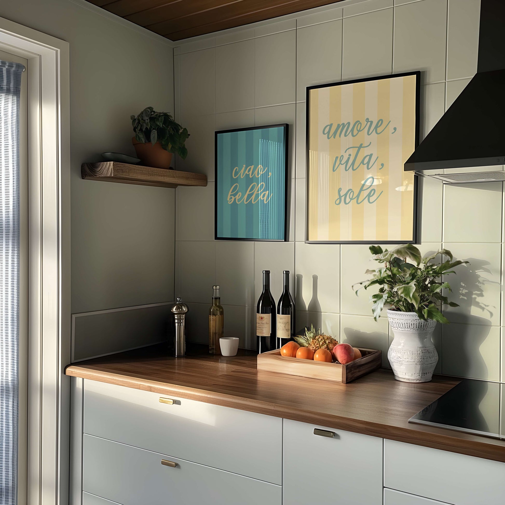 Verleihen Sie Ihrer Einrichtung mit diesem fröhlichen Poster zum Ausdrucken einen Hauch italienischer Sonne. Mit den Worten „Amore, Vita, Sole“ (Liebe, Leben, Sonne) in verspielter Schrift auf sonnengelben Streifen strahlt dieses Design Freude und mediterranen Charme aus – perfekt für Küchen, Wohnzimmer oder Bilderwände.