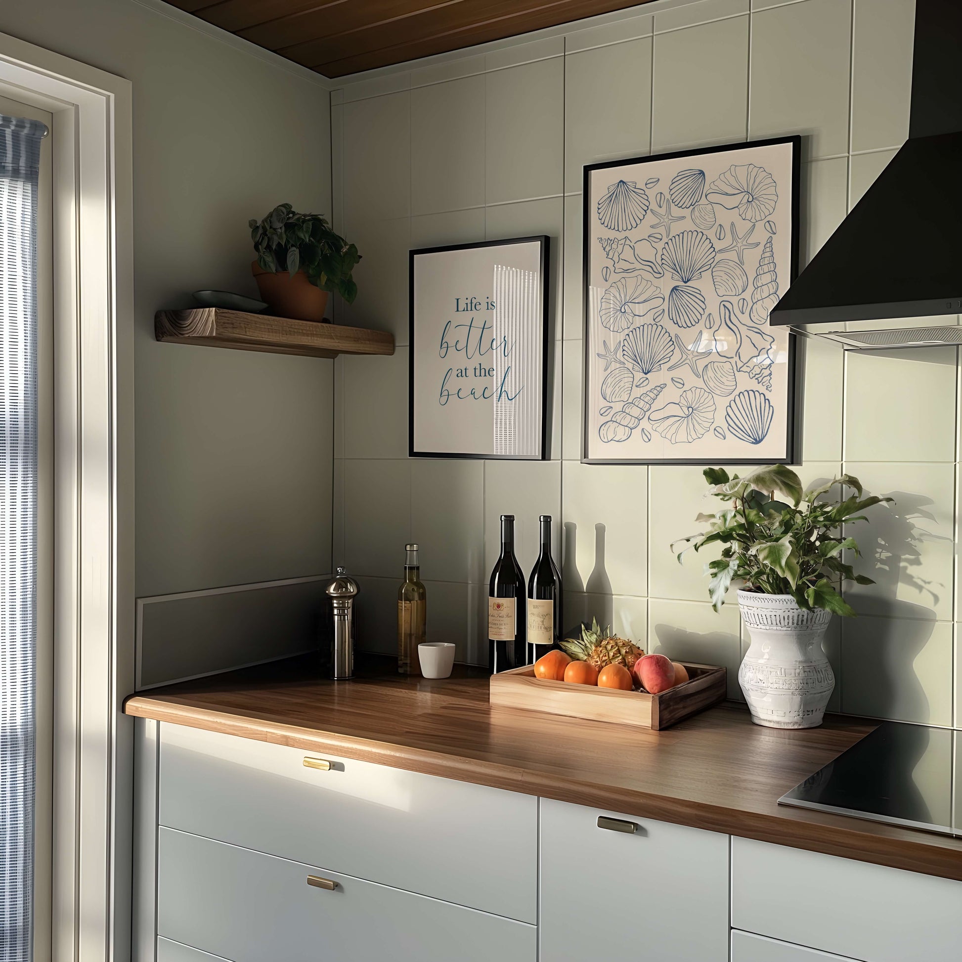 Holen Sie sich den Strand ins Haus mit diesem frischen, küsteninspirierten Posterset. Es kombiniert das handgeschriebene Zitat „Life is Better at the Beach“ mit einer wunderschön illustrierten Muschelsammlung. Ob in Küche, Bad oder Flur – dieses Set verleiht jedem Raum luftige Eleganz und einen Hauch von Meeresruhe.