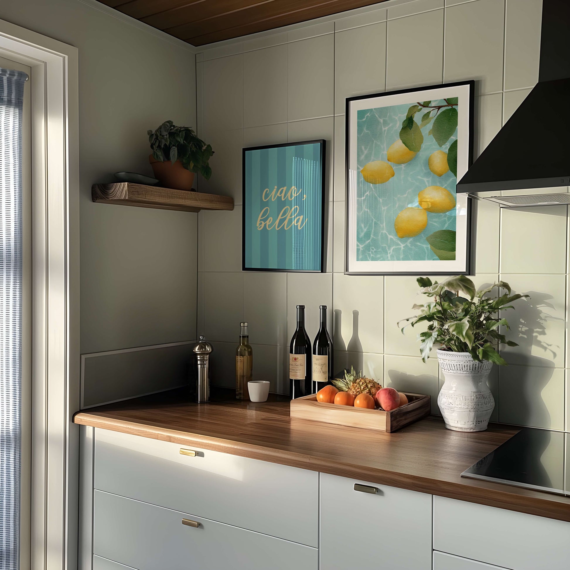 Verleihen Sie Ihrer Küche oder Ihrem Essbereich mit diesem fröhlichen Posterset einen Hauch italienischen Charme. Mit leuchtenden Sommerzitronen und dem ikonischen Spruch „Ciao, Bella“ strahlt dieses Set Wärme und Persönlichkeit aus. Inspiriert vom mediterranen Lebensstil bringt es verspielten Stil und fröhliche Farben in Ihre Wohnkultur.