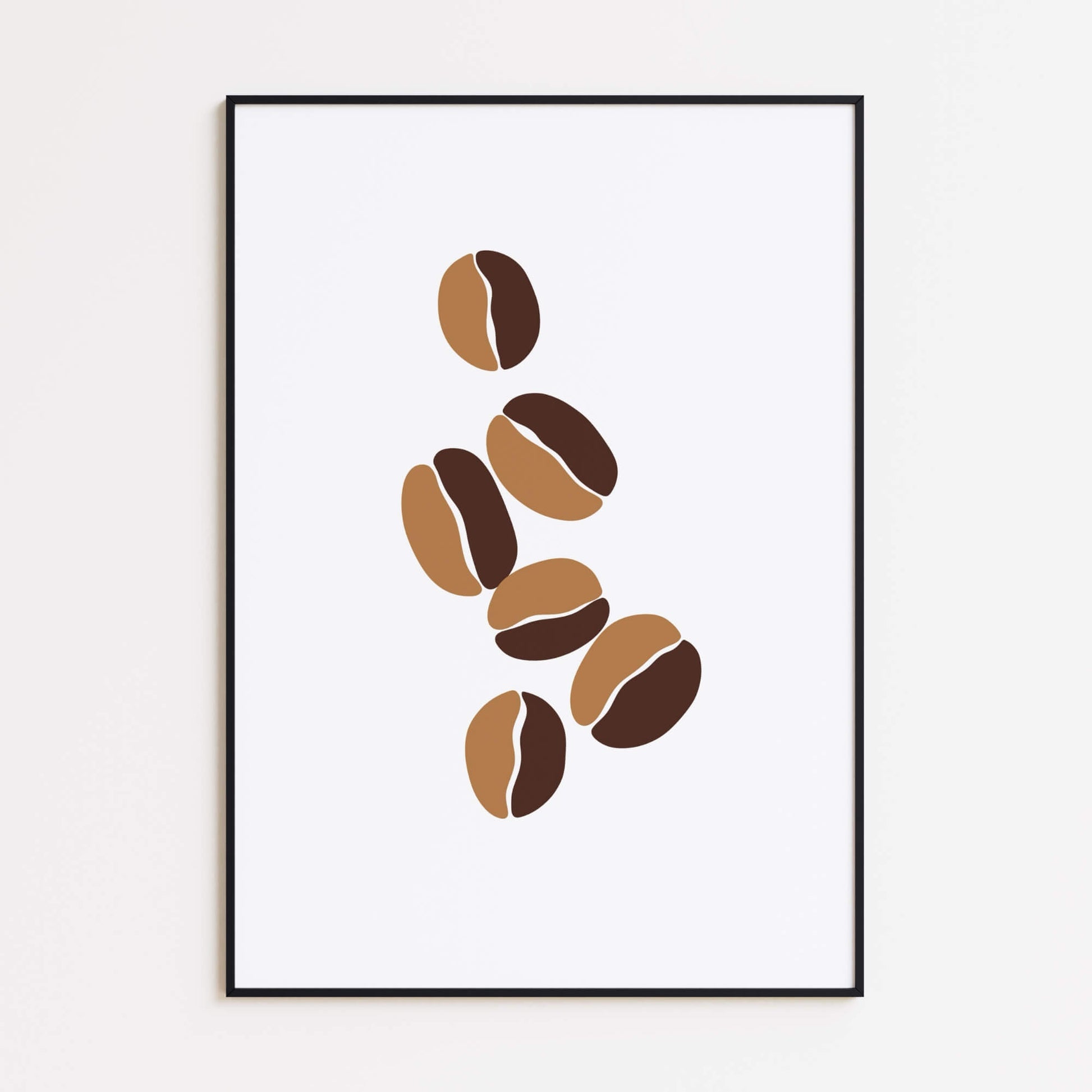 Eine minimalistische Illustration von Kaffeebohnen in warmen Brauntönen, arrangiert in einem ausgewogenen und eleganten Design. Perfekt für Kaffeeliebhaber, verleiht dieses Poster Küchen, Cafés oder Essbereichen eine gemütliche und zugleich stilvolle Note. Kombinieren Sie es mit anderen Kaffeemotiven für einen kompletten Look.