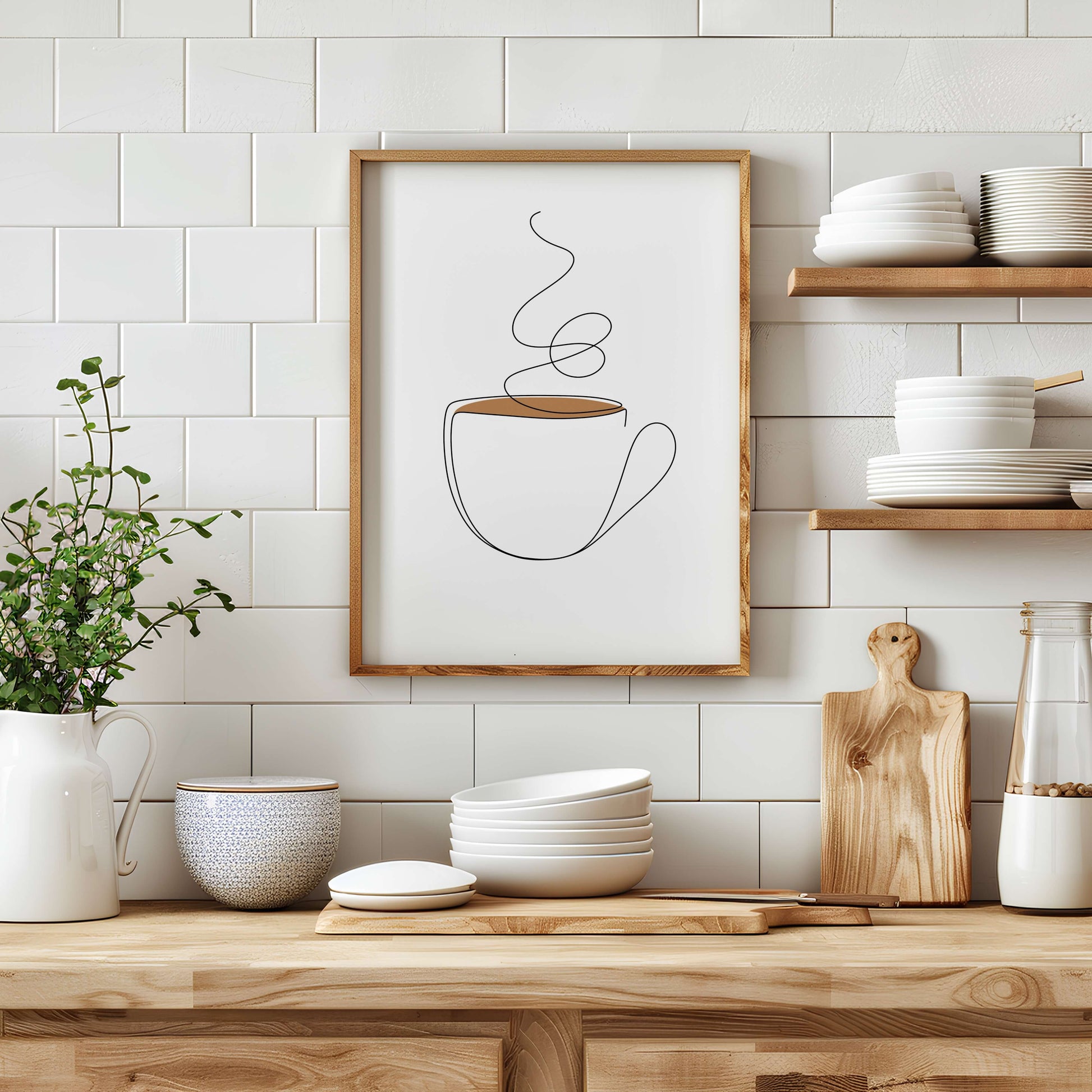 Dieses minimalistische Poster zeigt eine einzeilige Illustration einer dampfenden Kaffeetasse, akzentuiert mit warmen Brauntönen. Das klare und moderne Design ist perfekt für Kaffeeliebhaber und verleiht Küchen, Cafés oder Kaffeeecken eine gemütliche und zugleich stilvolle Note. Kombinieren Sie es mit anderen Kaffeemotiven für eine charmante Bilderwand.