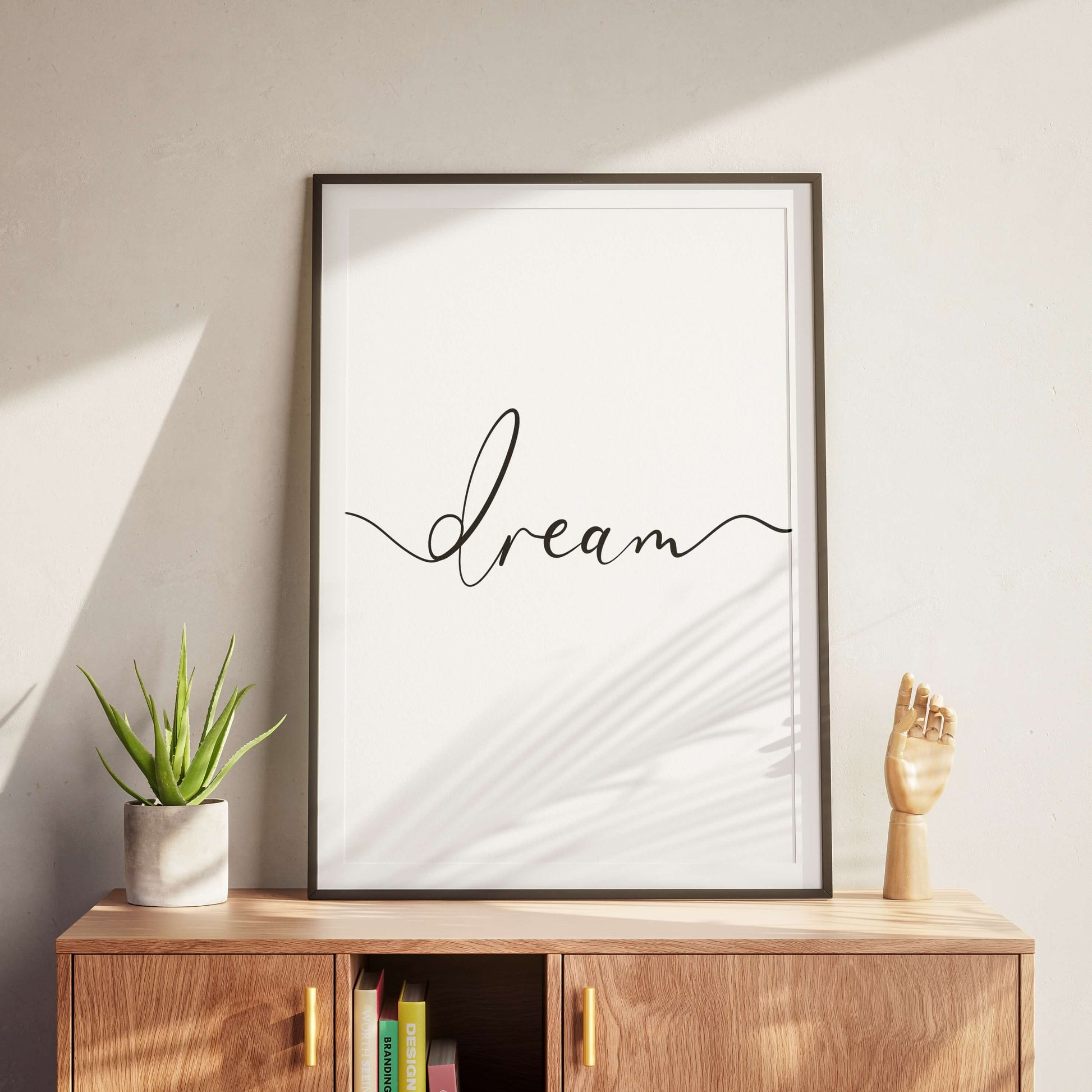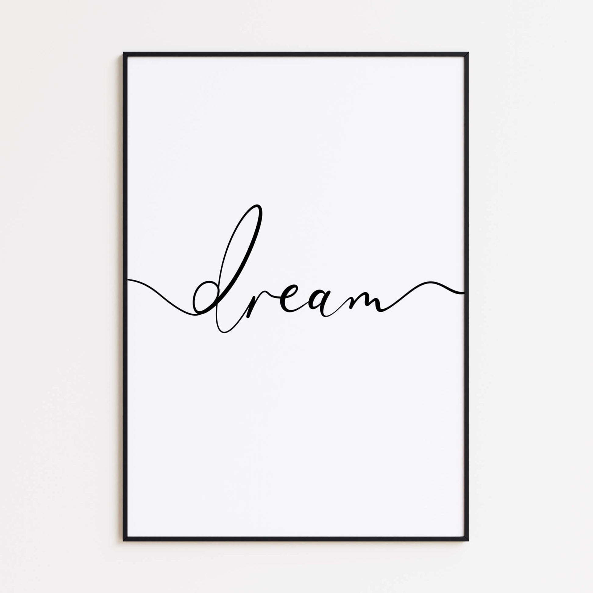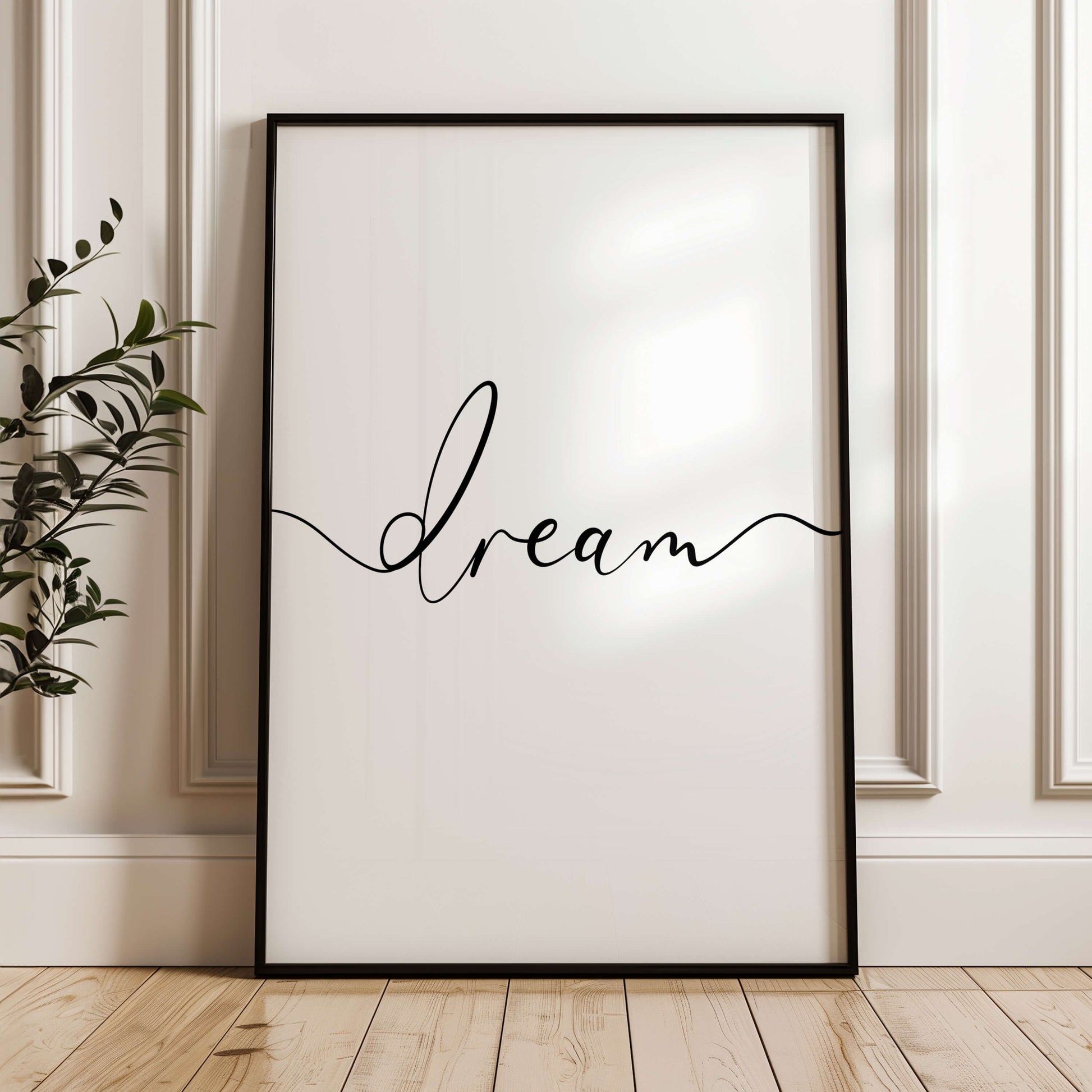 Dieses druckbare Poster zeigt das Wort „Dream“ in eleganter Handschrift, die anmutig über das Design fließt. Ein poetischer und inspirierender Akzent, der Leichtigkeit und Kreativität in jedes Interieur bringt.
