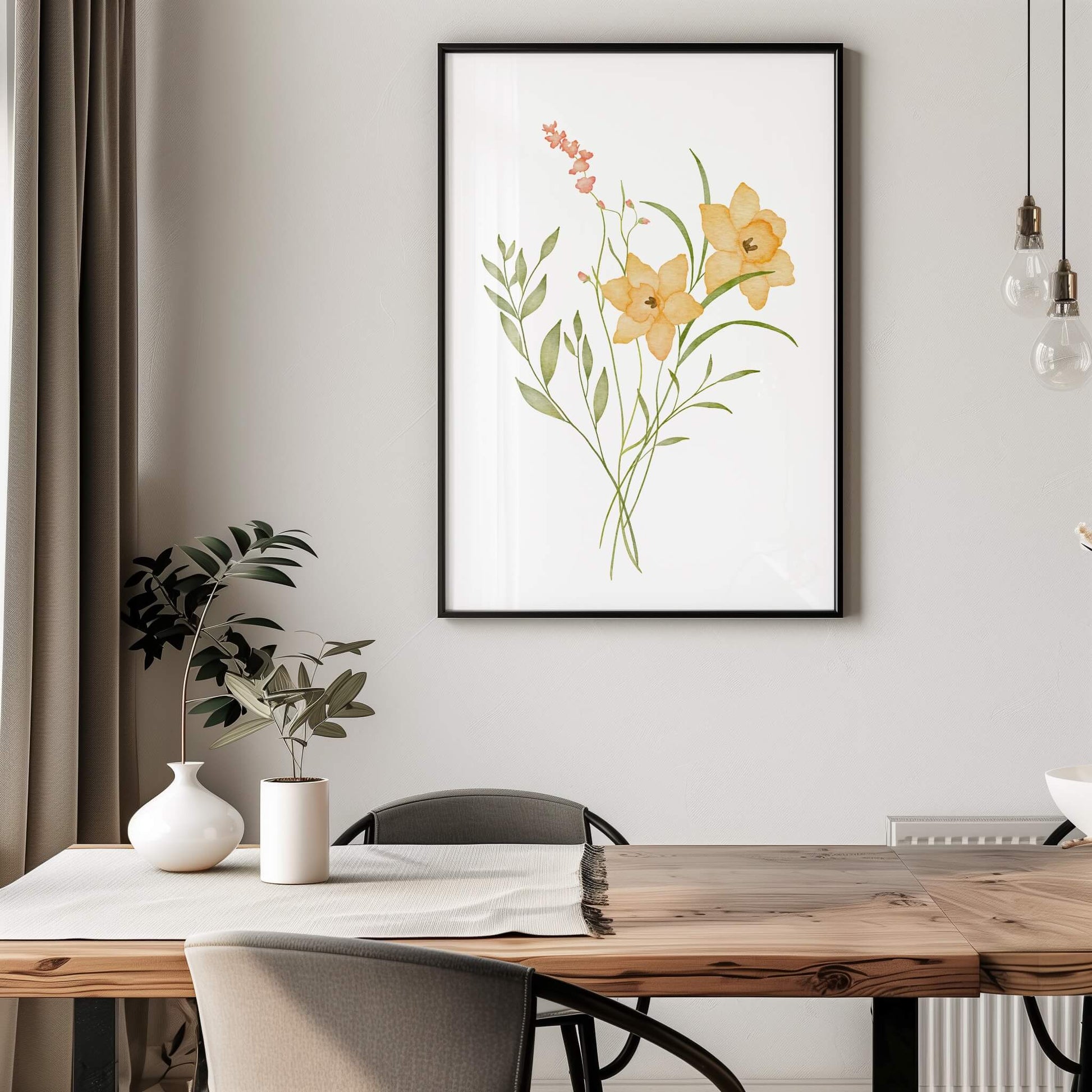 Dieses druckbare Poster zeigt einen wunderschön illustrierten Strauß Freesien in leuchtenden Gelbtönen, ergänzt durch zartes Grün. Sein ruhiges Design macht es zu einer zeitlosen Ergänzung für jeden Wohnraum.