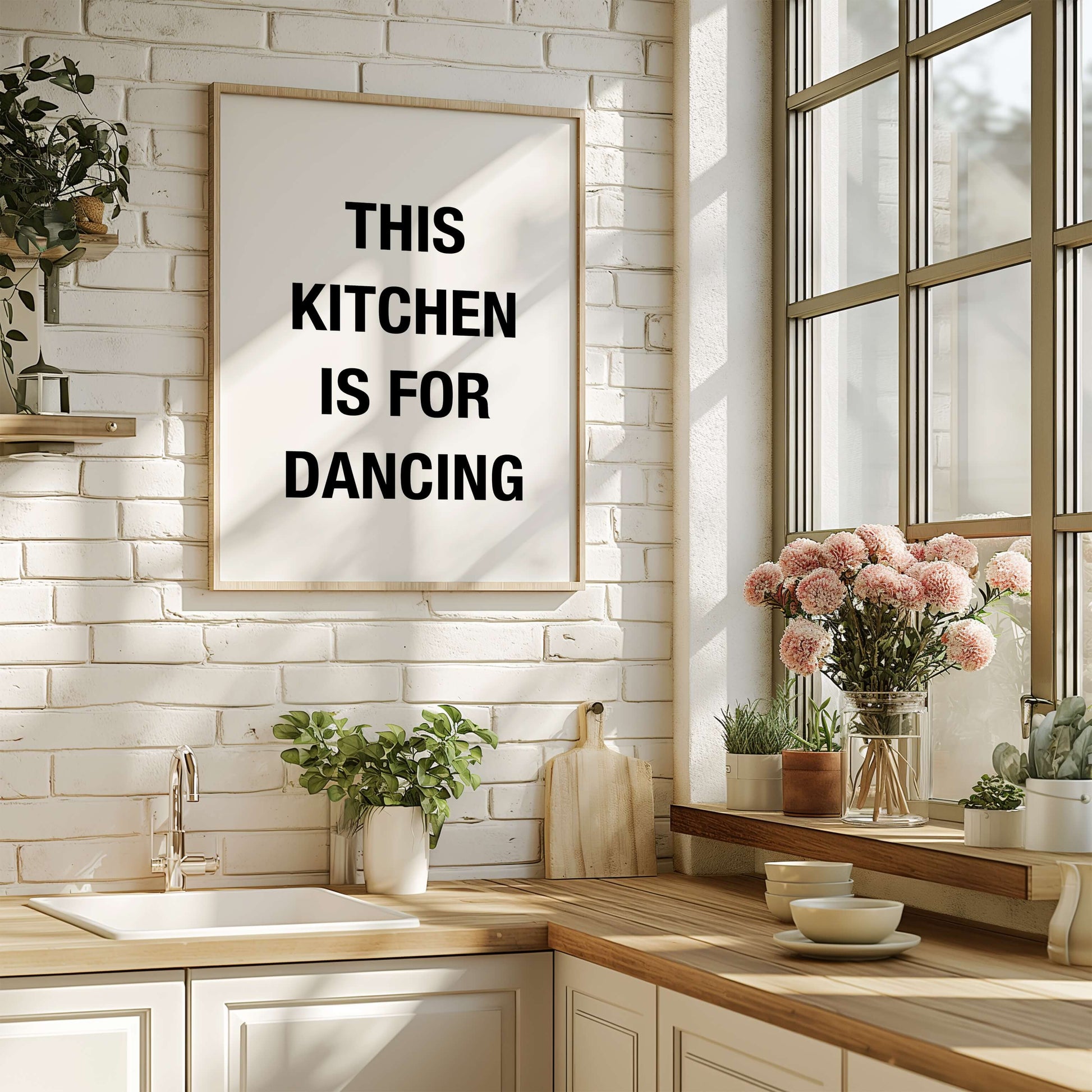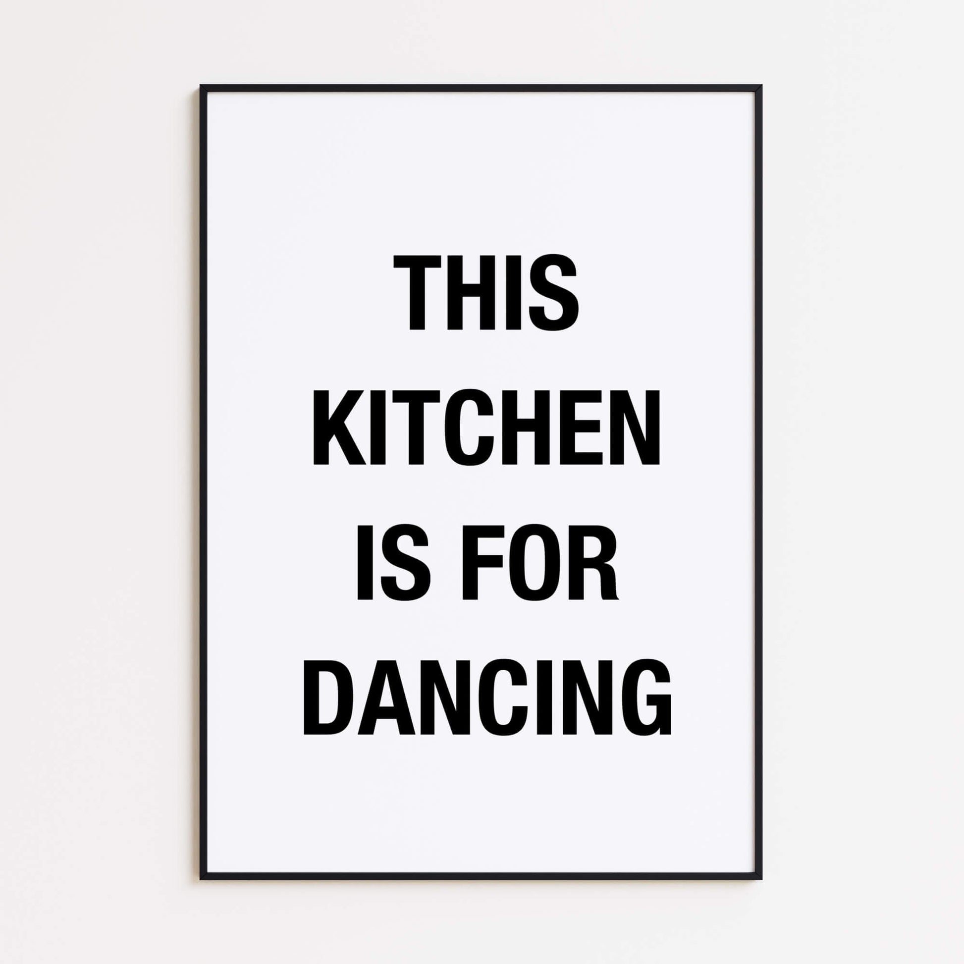 Dieses druckbare Poster besticht durch seine kräftige Typografie und den verspielten Satz „This kitchen is for dancing“. Ein lustiges und lebendiges Statement, perfekt, um Küchen und Essbereichen Energie und Freude zu verleihen.