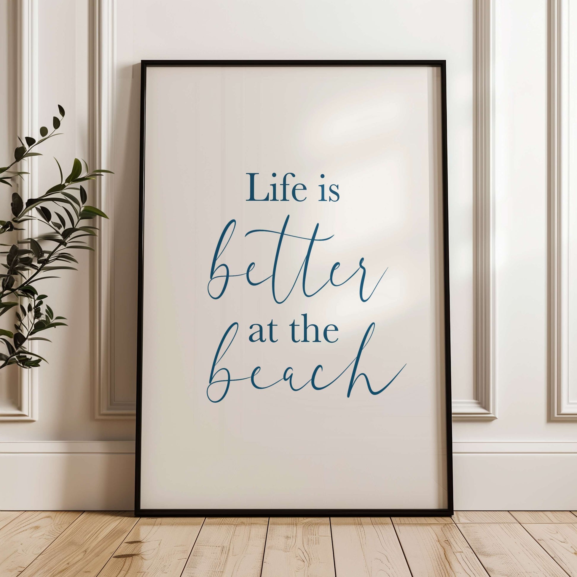 Feiern Sie Ihre Liebe zur Küste mit diesem druckbaren Poster mit dem herzlichen Spruch “Life is better at the beach”. Elegante Kalligrafie in Ozeanblau sorgt für eine luftige, ruhige Stimmung, die perfekt für Strandhäuser, Sommerhäuser oder jeden Ort ist, der einen Hauch von Küstencharme gebrauchen kann.