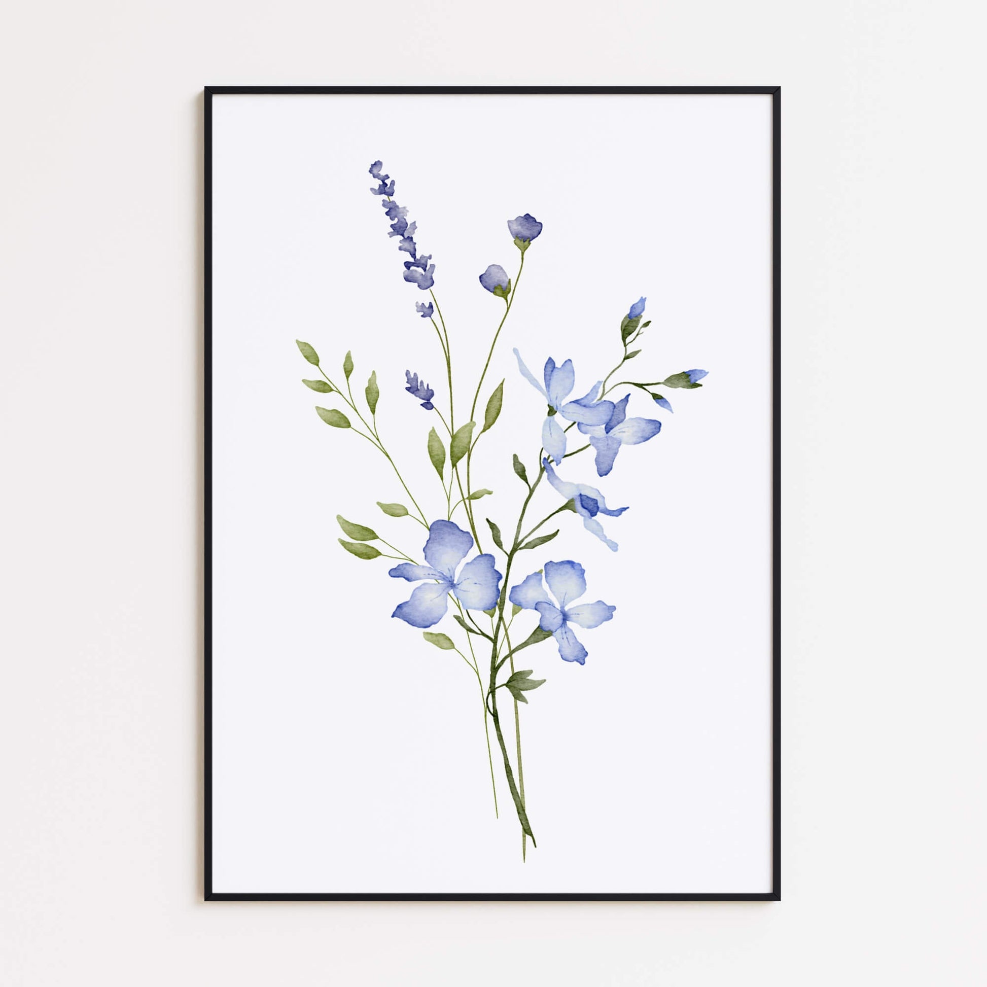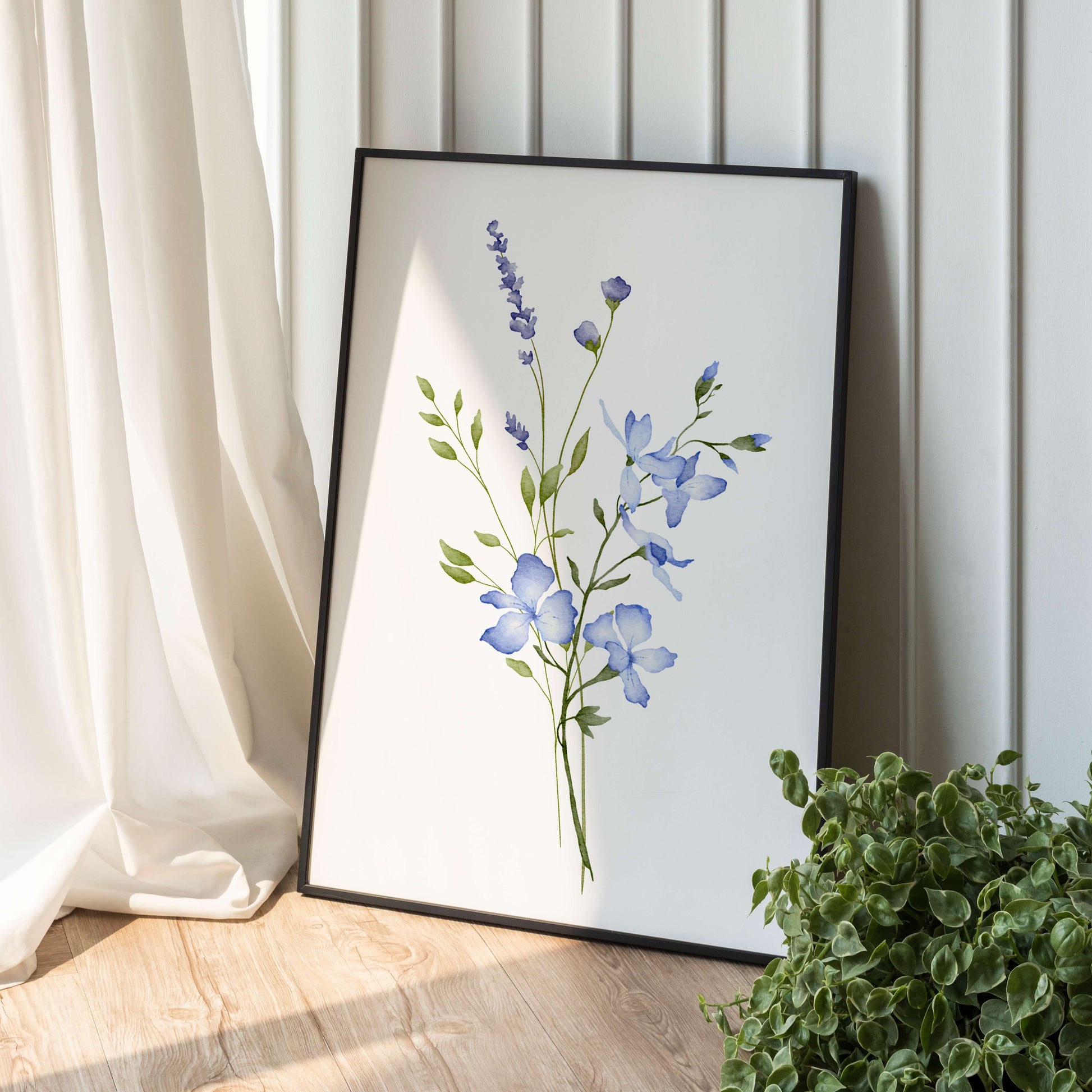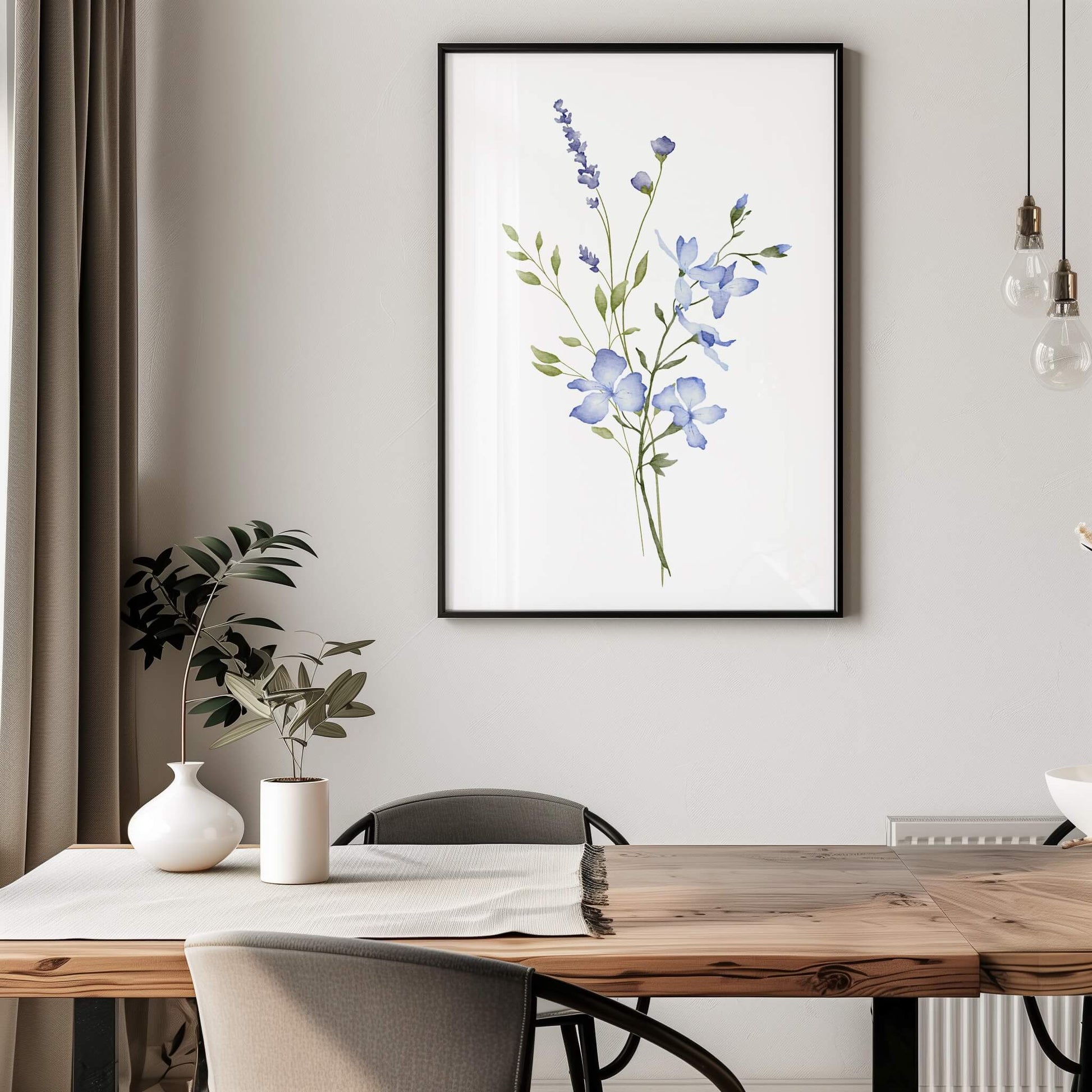 Dieses druckbare Poster zeigt ein zartes Arrangement von Leinblüten in beruhigenden Blautönen, akzentuiert durch sanftes Grün. Perfekt, um Ihrer Einrichtung einen friedlichen und eleganten Charme zu verleihen.