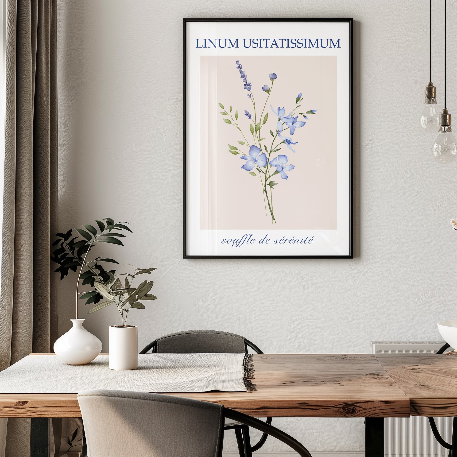 Dieses druckbare Poster zeigt eine zarte Illustration von Linum Usitatissimum-Posterblüten in beruhigenden Blautönen, ergänzt durch zartgrünes Laub. Der französische Text „Souffle de sérénité“ unterstreicht die ruhige und elegante Ausstrahlung und macht es zu einer zeitlosen Ergänzung für jede Wohnkultur.