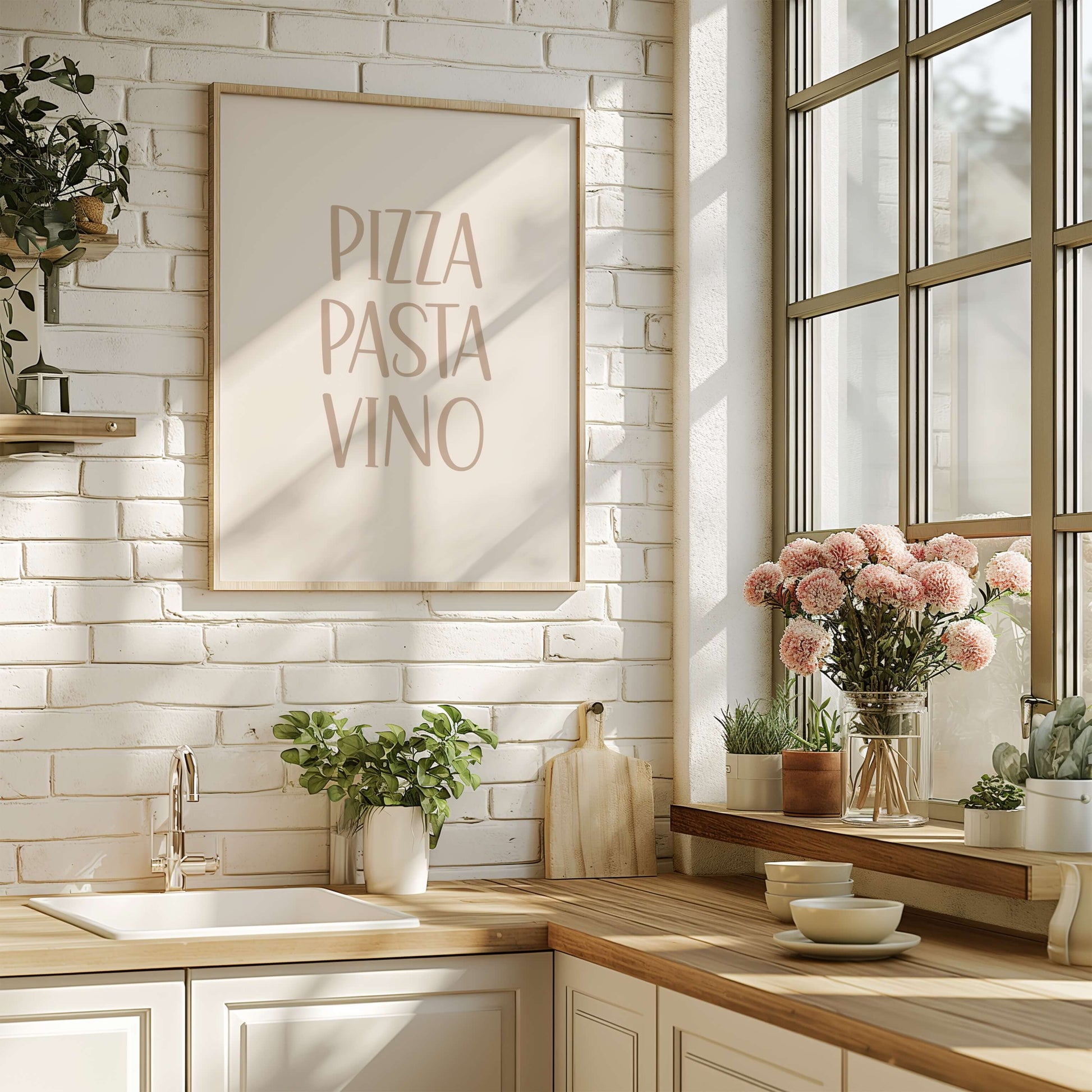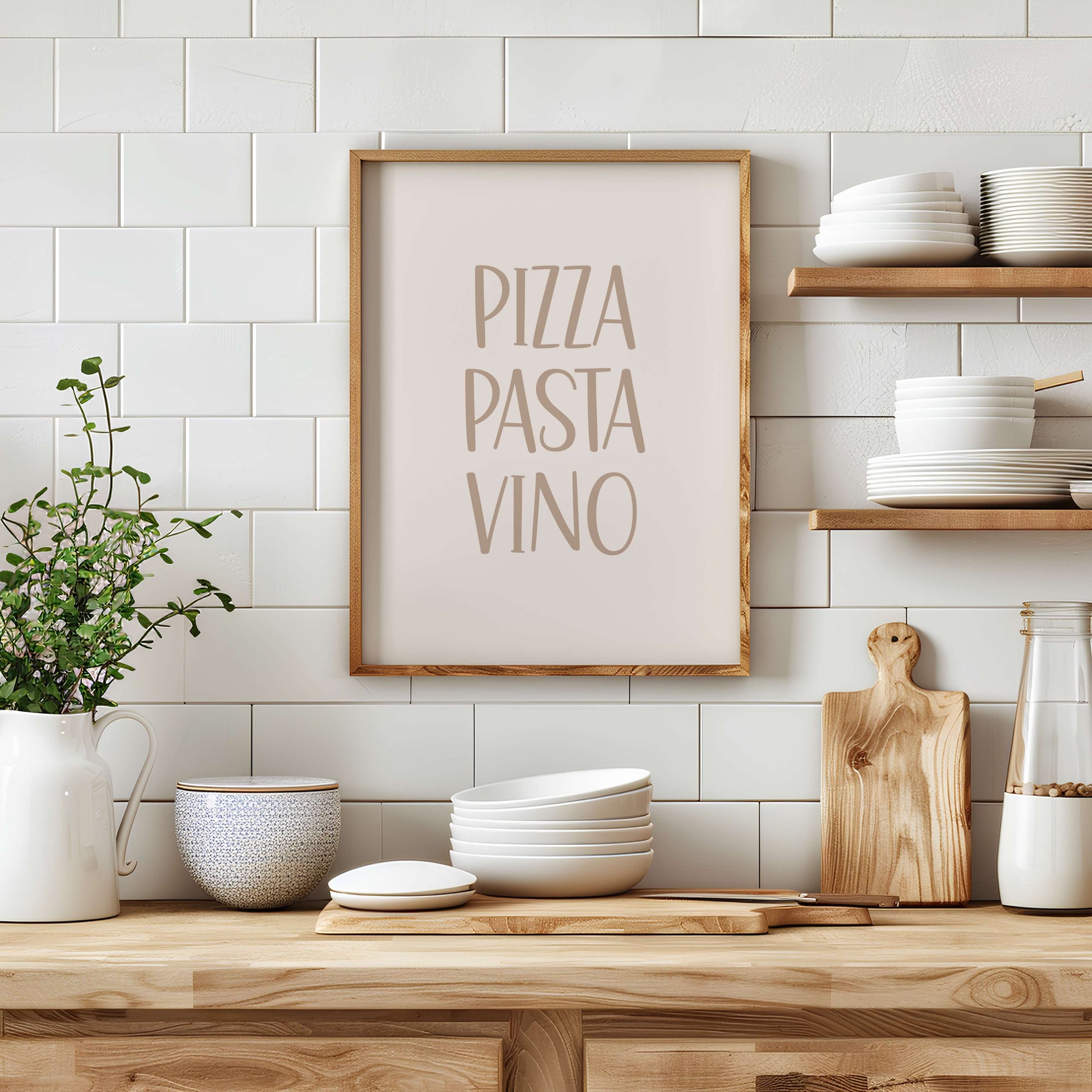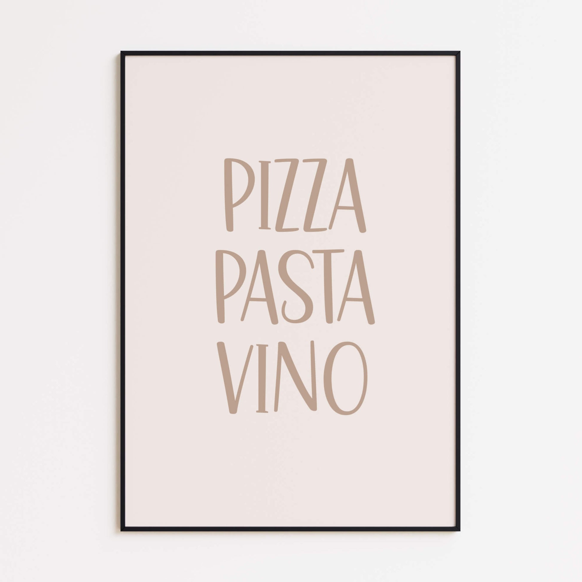 Dieses druckbare Poster bringt italienisches Flair direkt in Ihre Küche oder Ihren Essbereich. Mit verspielter Typografie und den Worten Pizza, Pasta, Vino ist es das perfekte Poster für Feinschmecker, die zu Hause das süße Leben genießen.