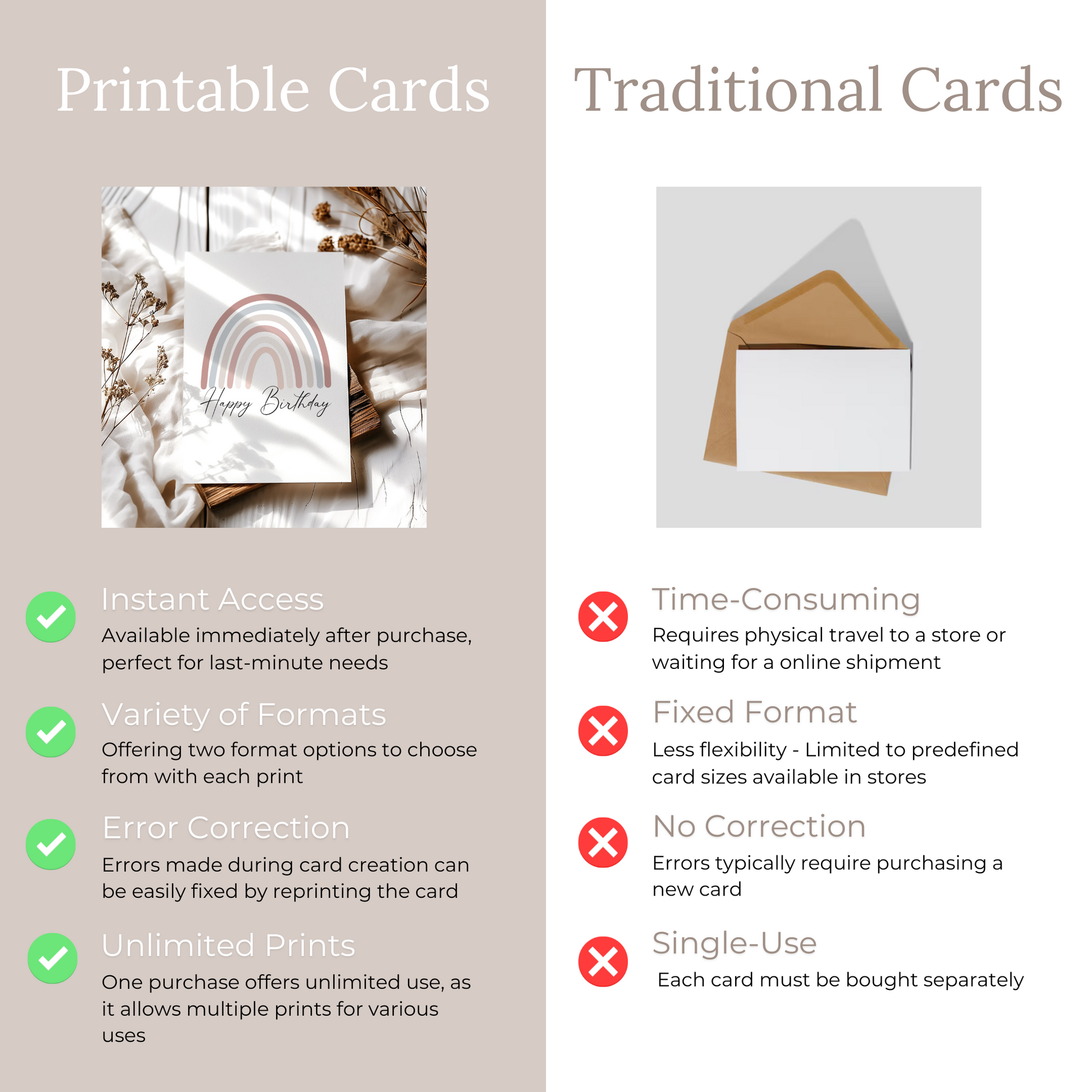 Schnell, umweltfreundlich und stressfrei: Unsere druckbaren Karten bieten eine einfache und bequeme Möglichkeit, schöne, individuelle Grüße zu versenden. Wenn Ihnen ein Fehler unterläuft, ist das kein Problem – drucken Sie die Karte einfach so oft neu, wie Sie möchten, ohne eine neue kaufen zu müssen. Da die Designs immer verfügbar sind, können Sie sie jederzeit so oft herunterladen und ausdrucken, wie Sie möchten. So haben Sie endlose Möglichkeiten, Ihre Kartensammlung zu personalisieren und zu aktualisieren.