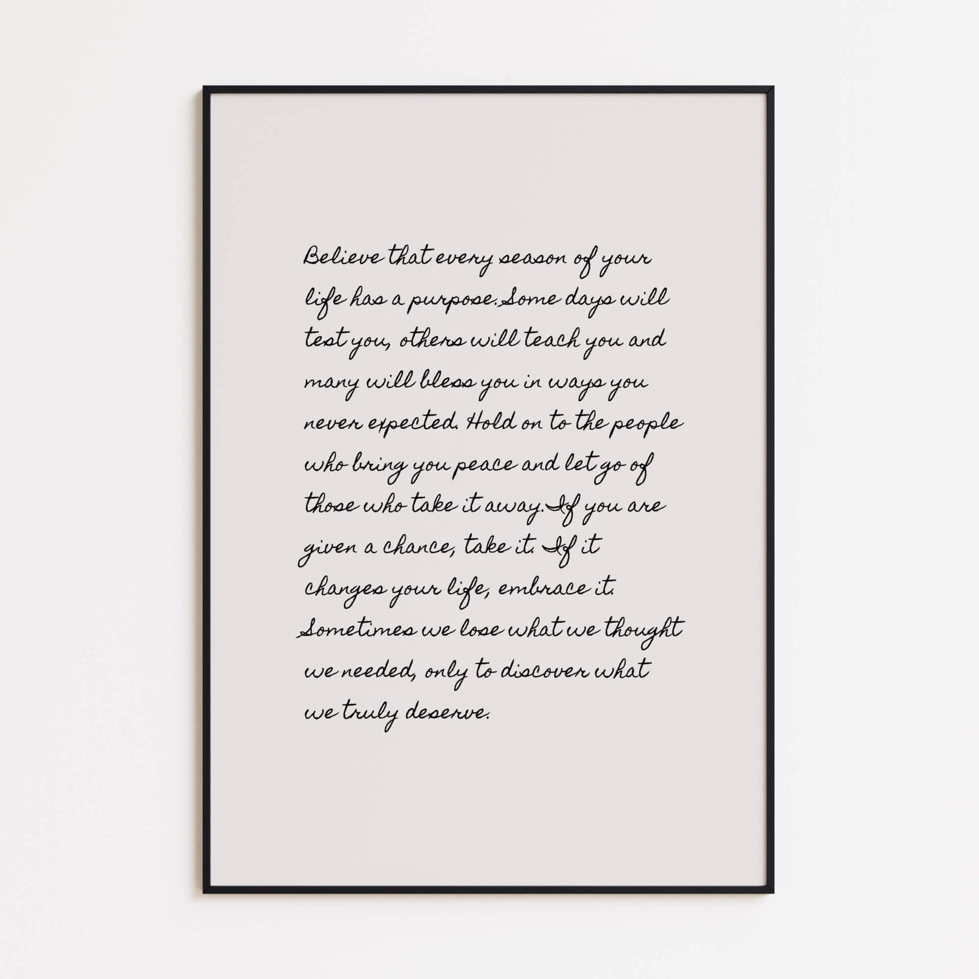 Dieses druckbare Poster zeigt eine elegante Handschrift mit inspirierenden Gedanken zu Wachstum, Resilienz und Dankbarkeit. Eine schöne Erinnerung daran, Veränderungen anzunehmen und das zu schätzen, was wirklich wichtig ist. Es verleiht jedem Interieur Tiefe und Bedeutung.
