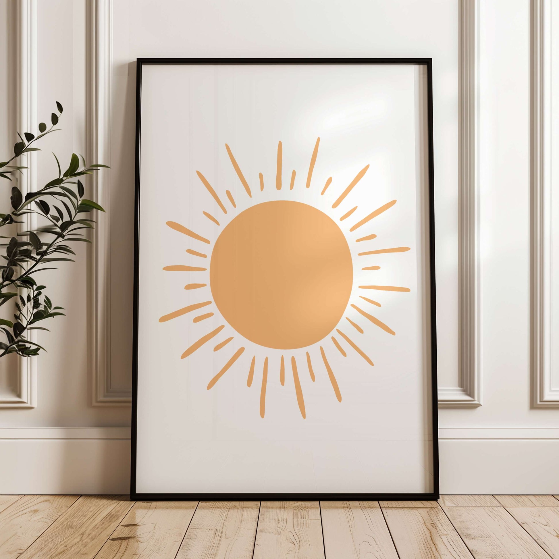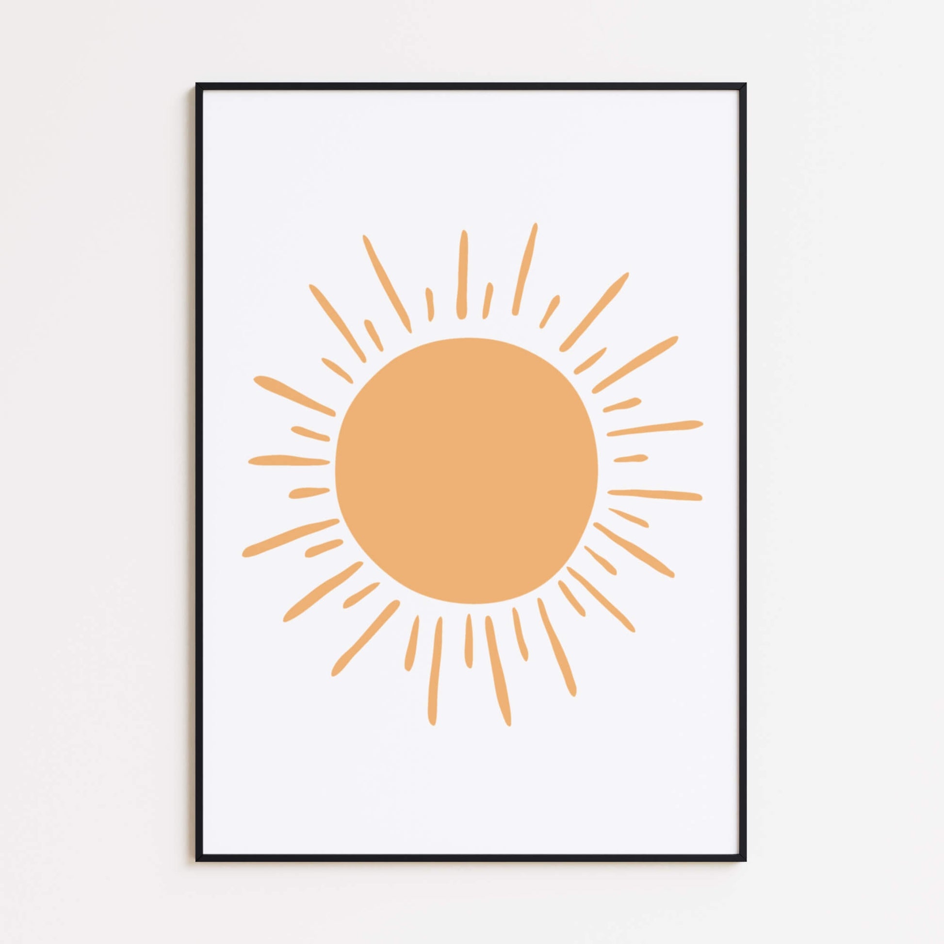 Versprühen Sie gute Laune mit diesem druckbaren Sonnenposter. Mit einer kräftigen, handgezeichneten Sonne in warmen Orangetönen verleiht dieses Design jedem Raum eine fröhliche, belebende Note. Es ist die perfekte Wahl für sonnige Küchen, Kinderzimmer oder überall dort, wo Sie täglich eine Dosis Licht brauchen.