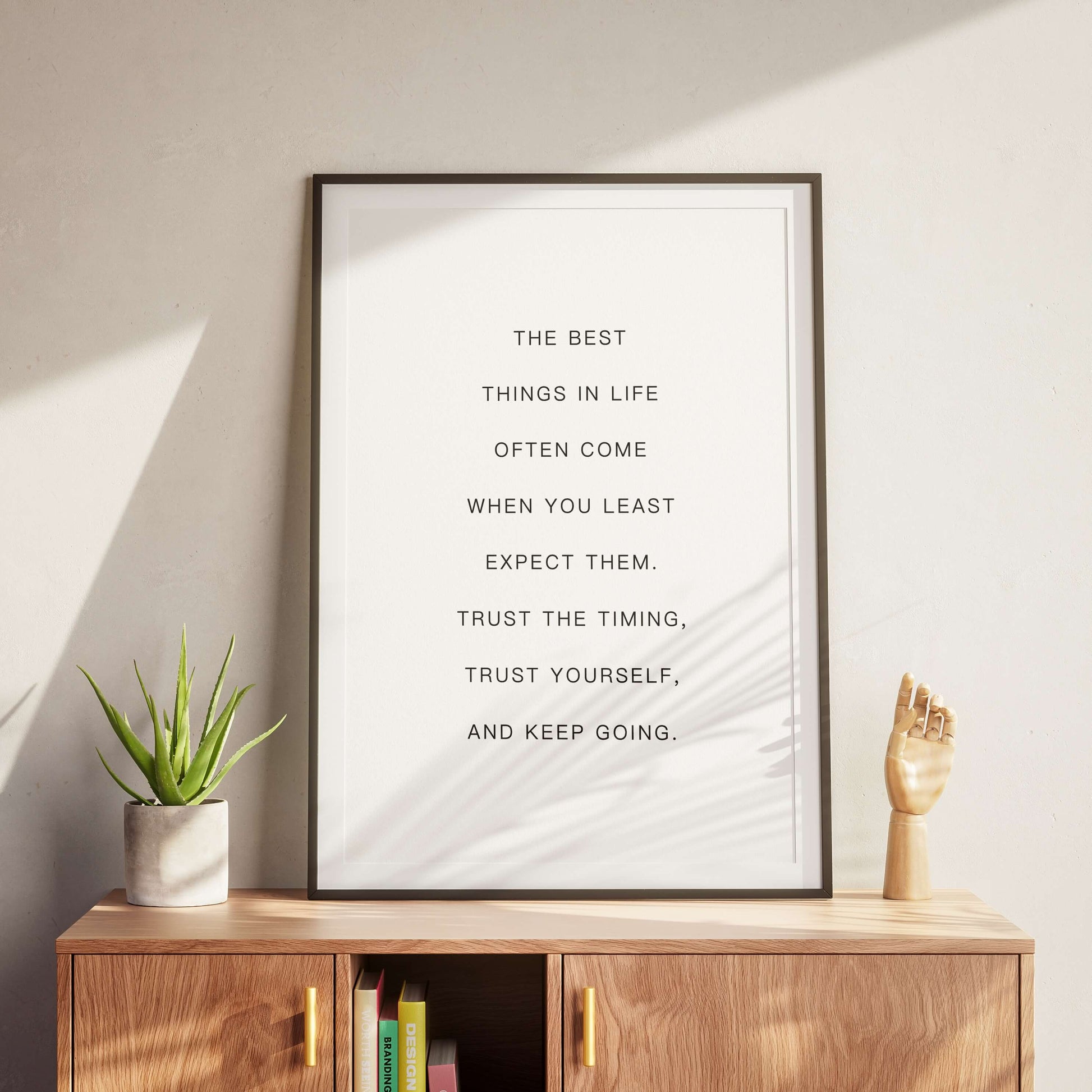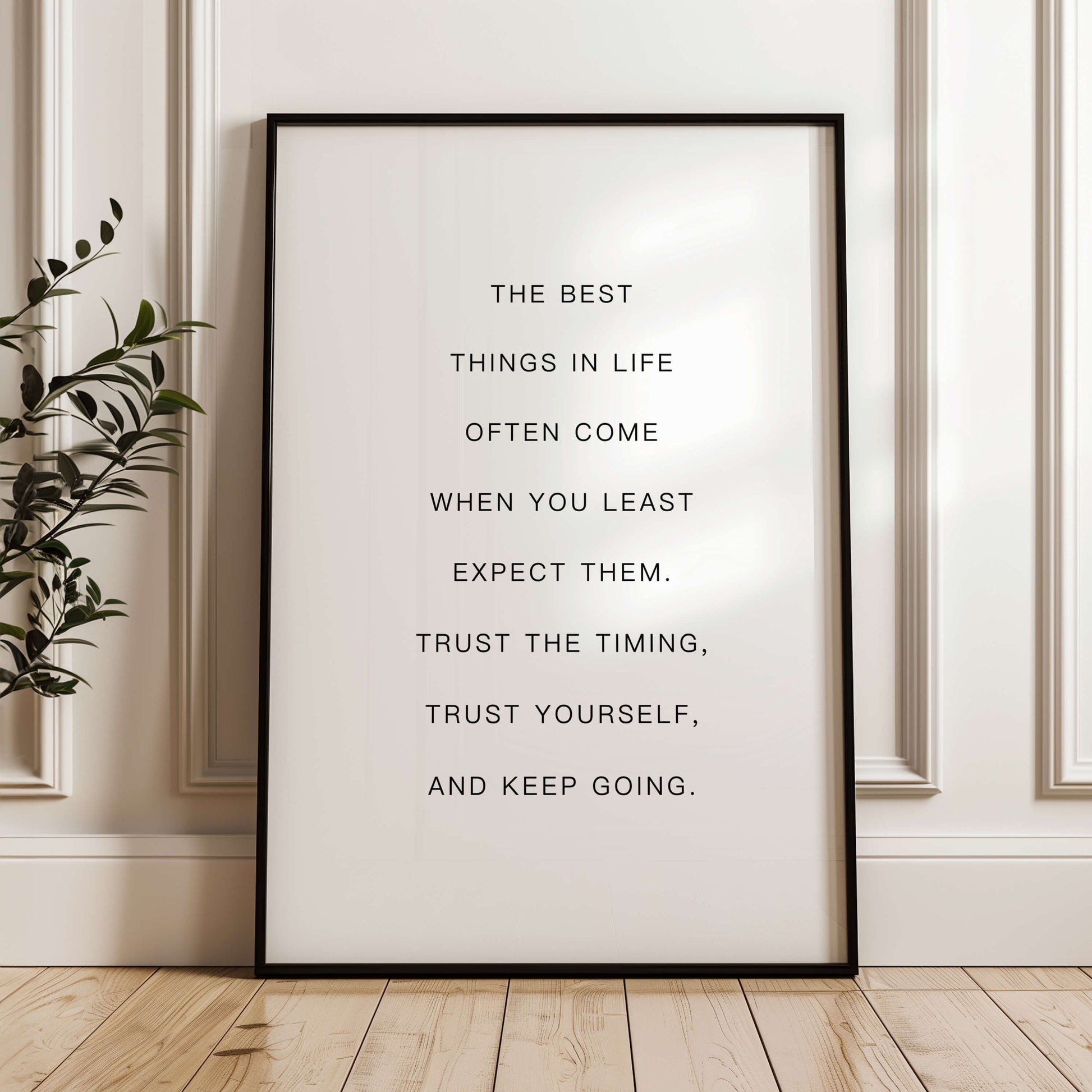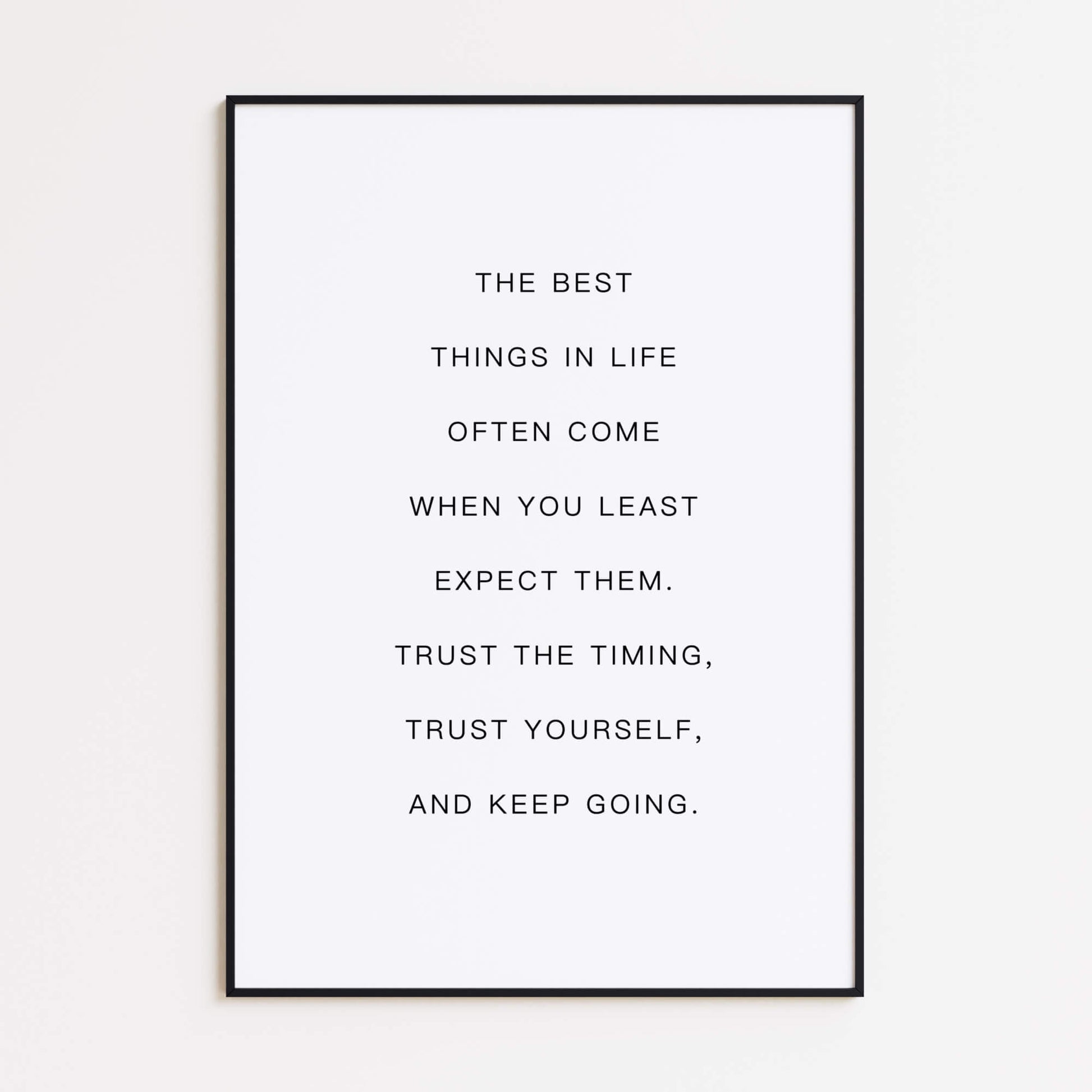 Dieses druckbare Poster präsentiert eine beruhigende Botschaft in minimalistischer Typografie und erinnert uns daran, dass die besten Dinge oft unerwartet passieren. Elegant und modern bringt es Ermutigung und Achtsamkeit in jedes Interieur.