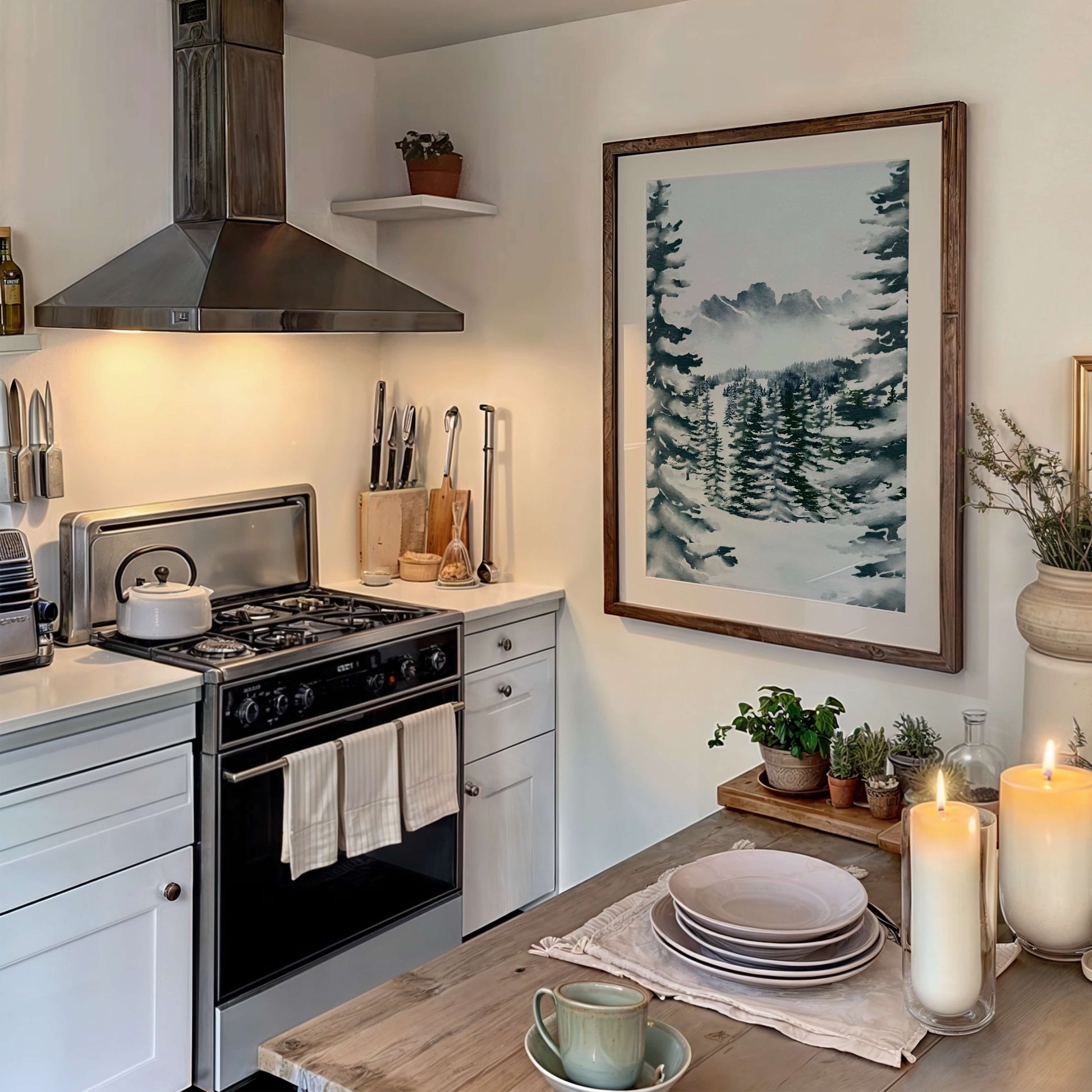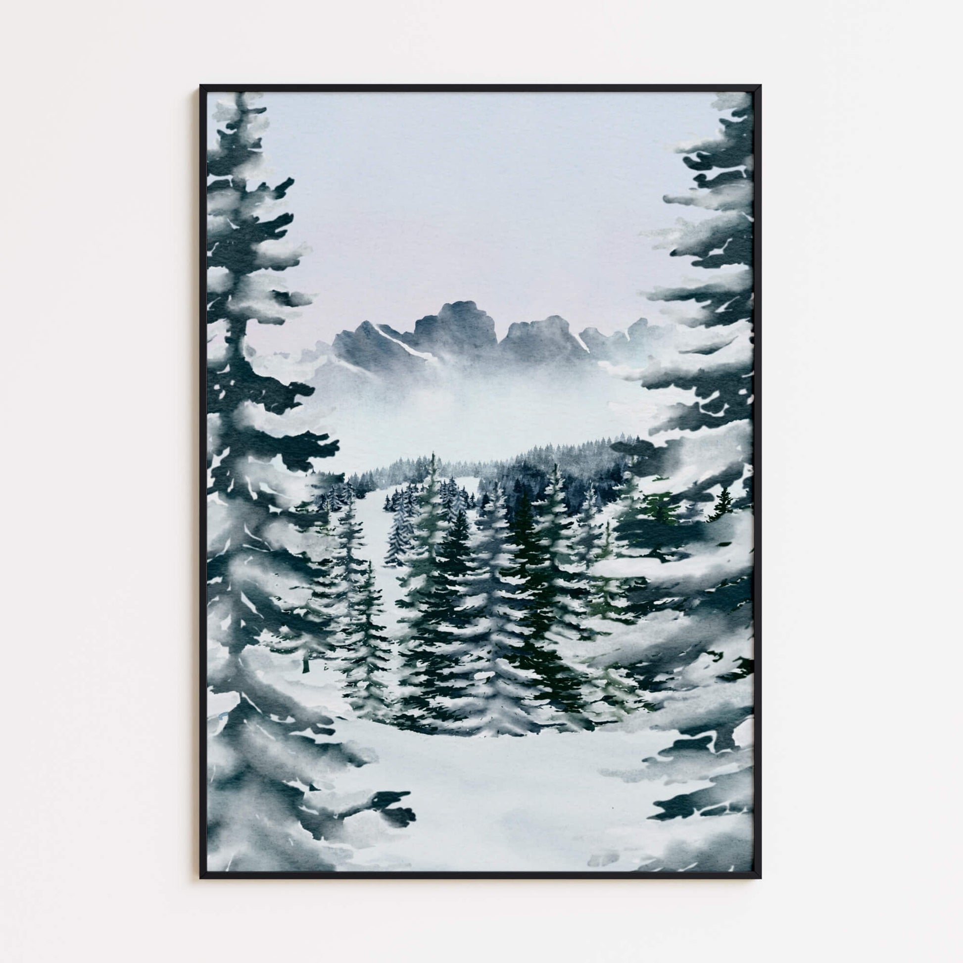 This poster shows a serene winter landscape with snow-covered fir trees and a mountain peak shrouded in mist. The cool blue and green tones create a peaceful, atmospheric mood that transforms any home into a quiet winter retreat. Perfect for adding a touch of winter elegance to living areas, entryways, or seasonal décor.